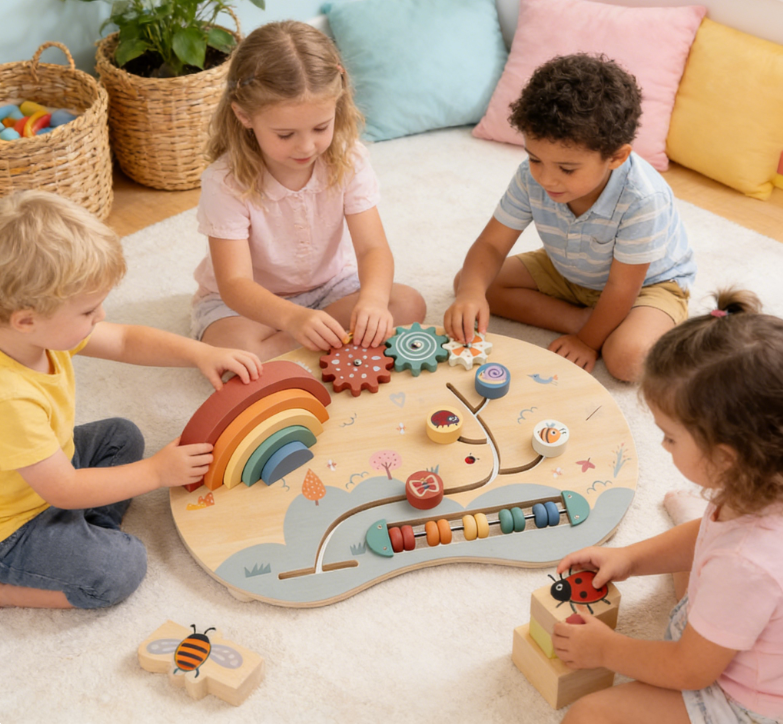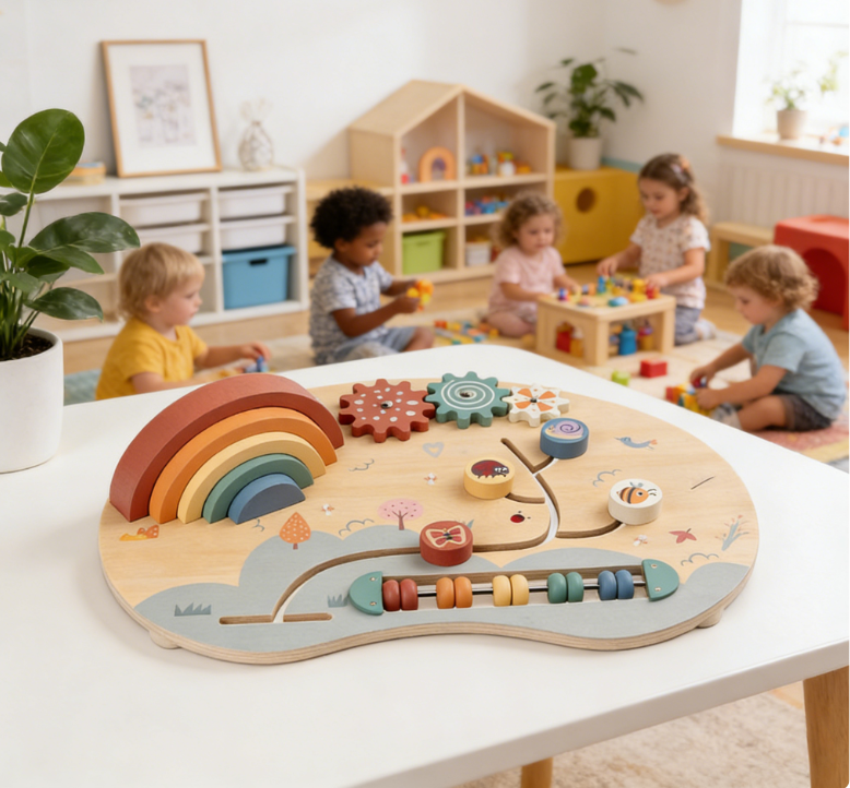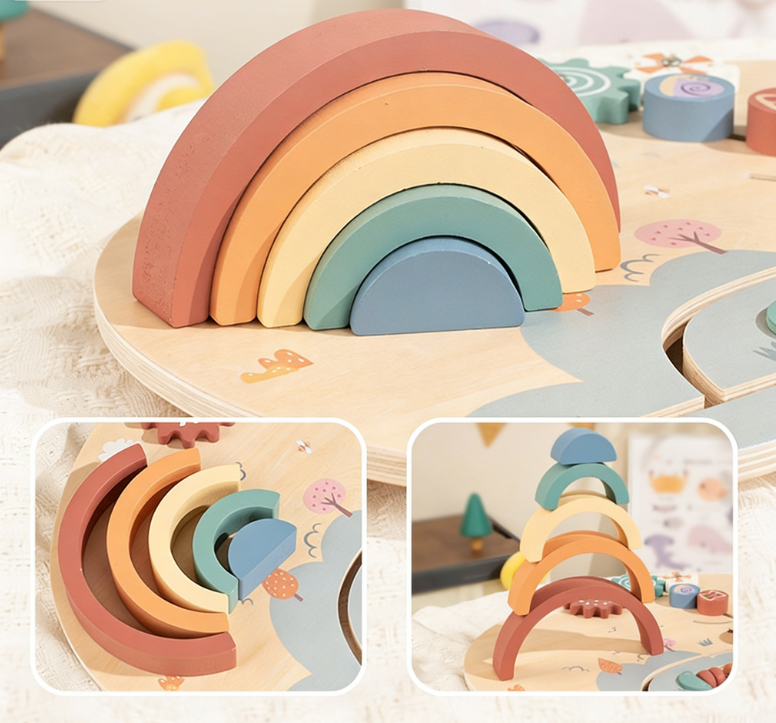 Pädagogisches Holz-Montessori-Spielzeug für Kinder – multifunktionales Holz-Aktivitätsspielset mit Zahnraddrehung, Perlenlabyrinth & Regenbogenstapler -MD2507